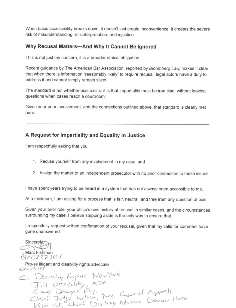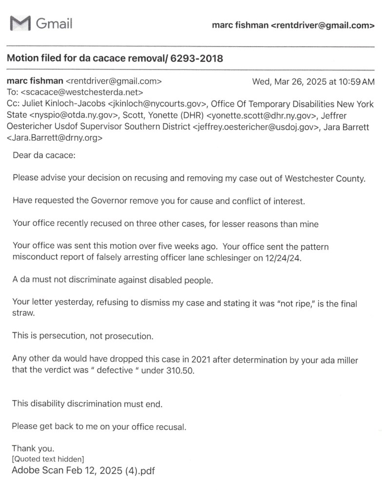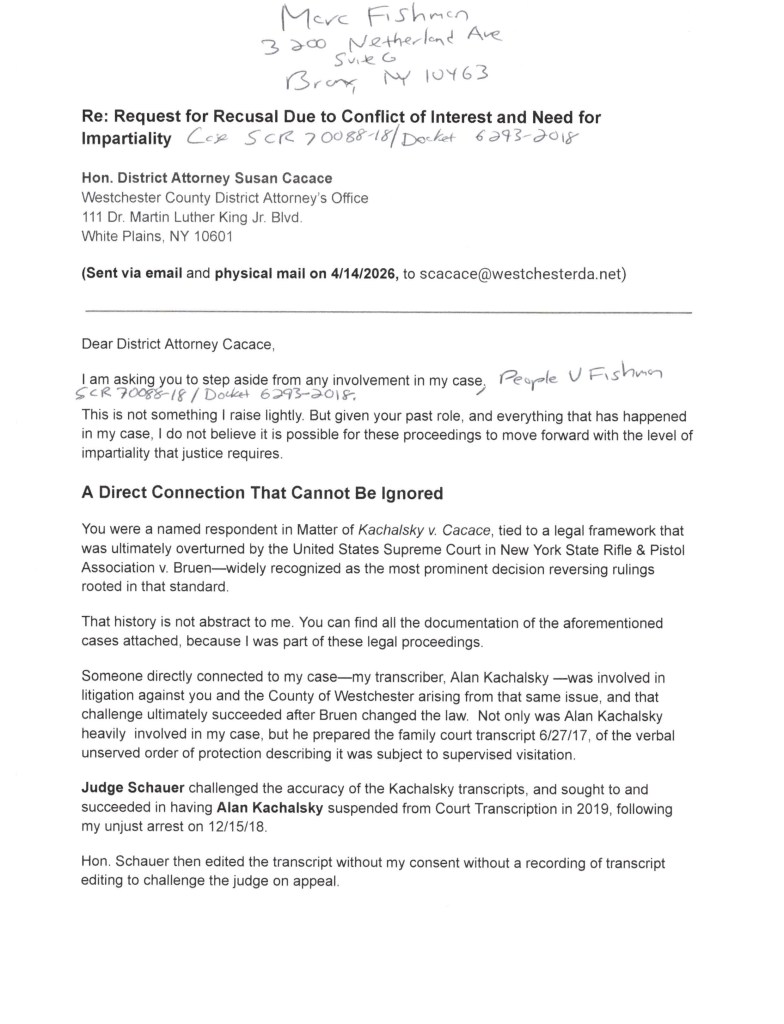 Marc Fishman’s request to DA Susan Cacace asking her to recuse herself from his case in the Westchester County District Court.
