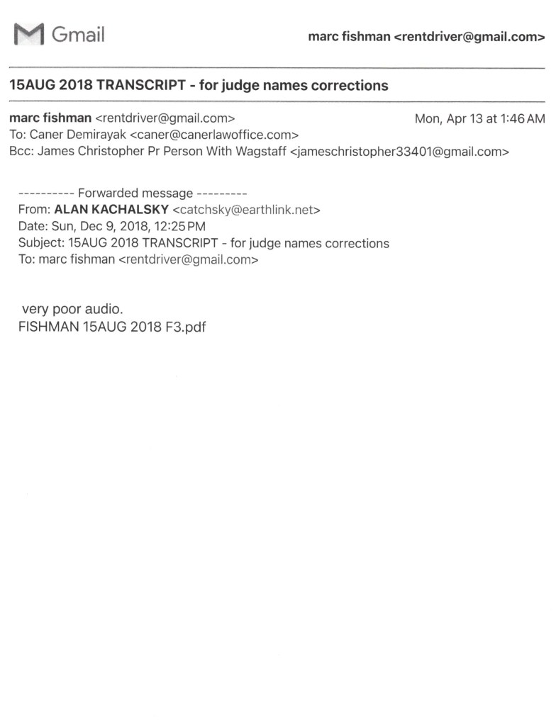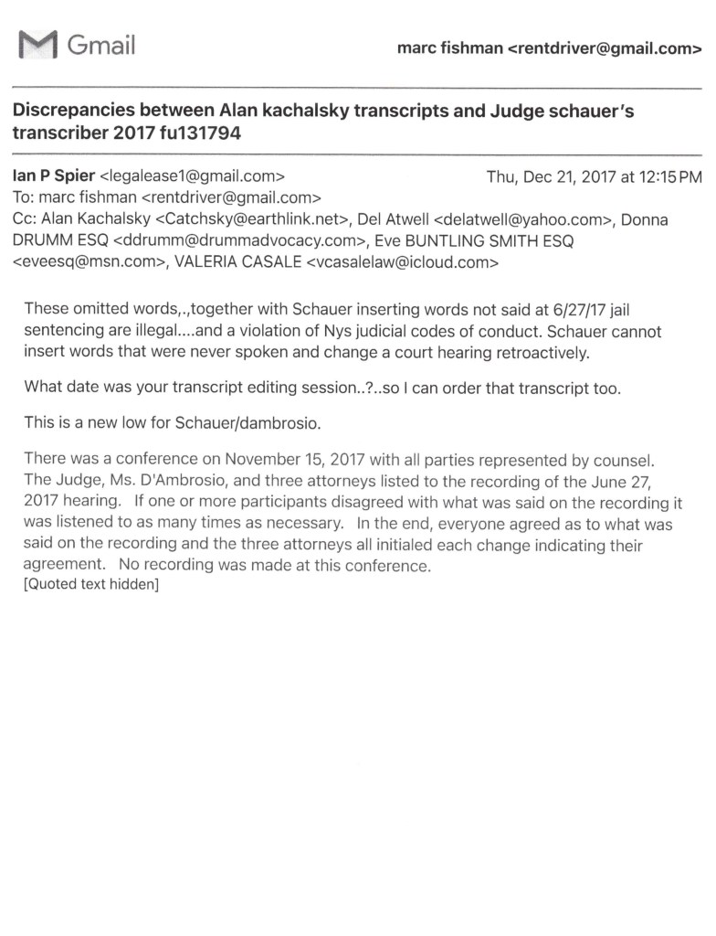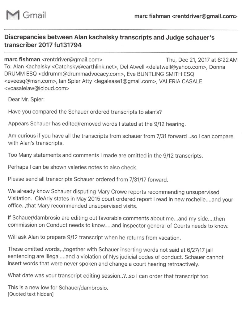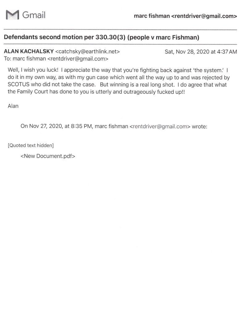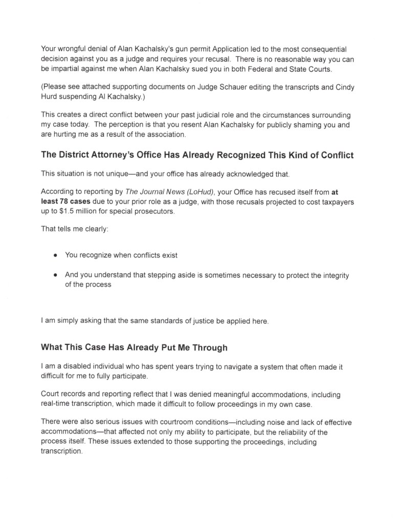 Am writing pro Se, seeking your immediate recusal in People v Fishman due to severe conflict of interest with underlying case party witness, my 10 year family court transcriber and attorney Alan Kachalsky in the underlying family court, Supreme Court, Idv and federal cases.